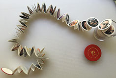 Accordion with swiveling ovals that support rose petal necklace and folded understructure. Mohawk Superfine and various Joss papers with rose petal necklace; letter press printing; laser prints with hand coloring; case of Thai gami over boards with magnetic closure, printed label.