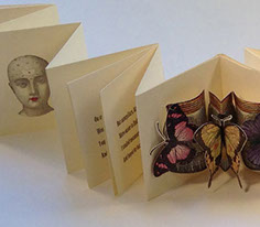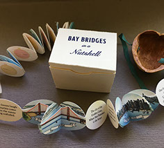 Based on a 1906 San Francisco Souvenir, this book was made as the official keepsake of the Miniature Book Society’s Grand Conclave XXXV held in Oakland in August 2017. The book makes a tour of the bridges that circle the San Francisco Bay with skylines of San Francisco and Oakland, and celebrates the 50th anniversary of the Summer of Love with a flipbook-style paper animation on the back side of the accordion (a heart changes into an acorn; a clock hand spins).