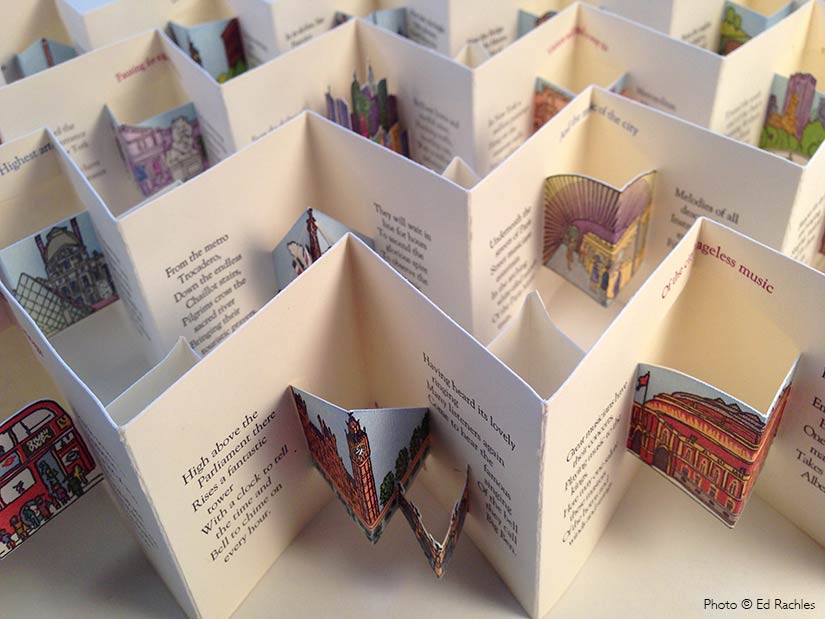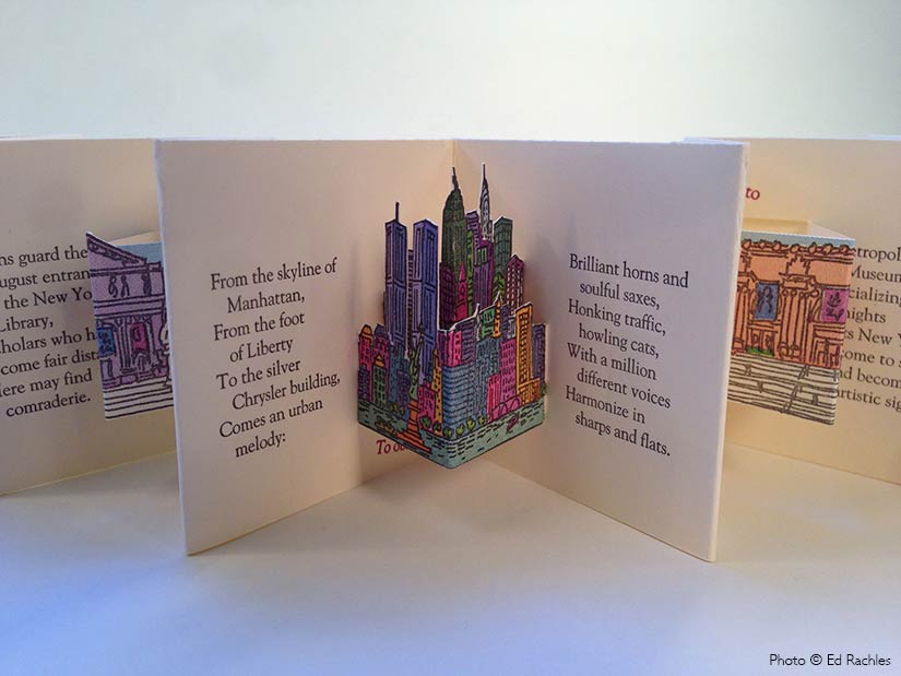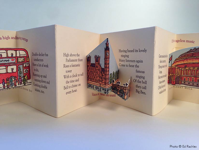 Mohawk Superfine cover, double-sided concertina with pop-up illustrations bound with removable spines in folded paper covers in a printed paper box; letterpress printed in five colors, cut and assembled by hand.