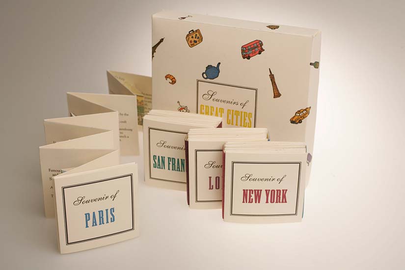 A boxed set of four books that tried to capture as eccentric souvenirs the sights of the four cities I have lived in.